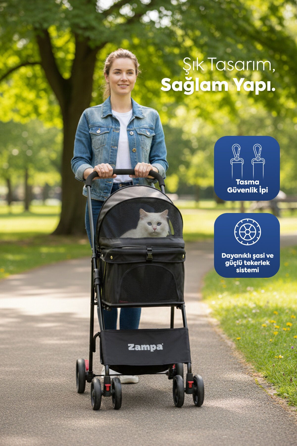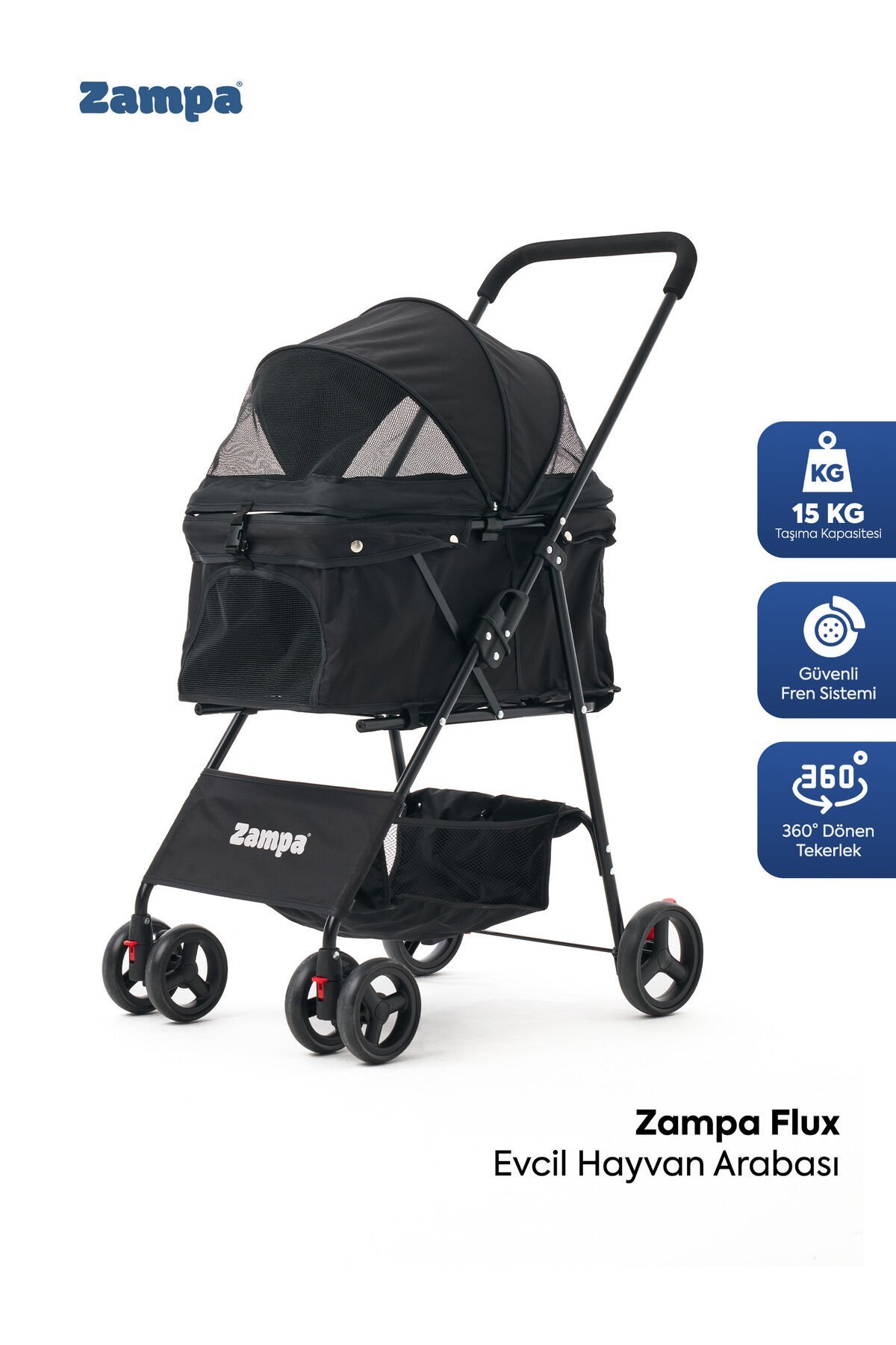 Evcil dostunuzla şehir içi gezilerde, park yürüyüşlerinde ve günlük seyahatlerde konforu ön planda tutan Zampa Flux Kedi & Köpek Arabası , güçlü taşıma kapasitesi ve modern tasarımıyla öne çıkar.