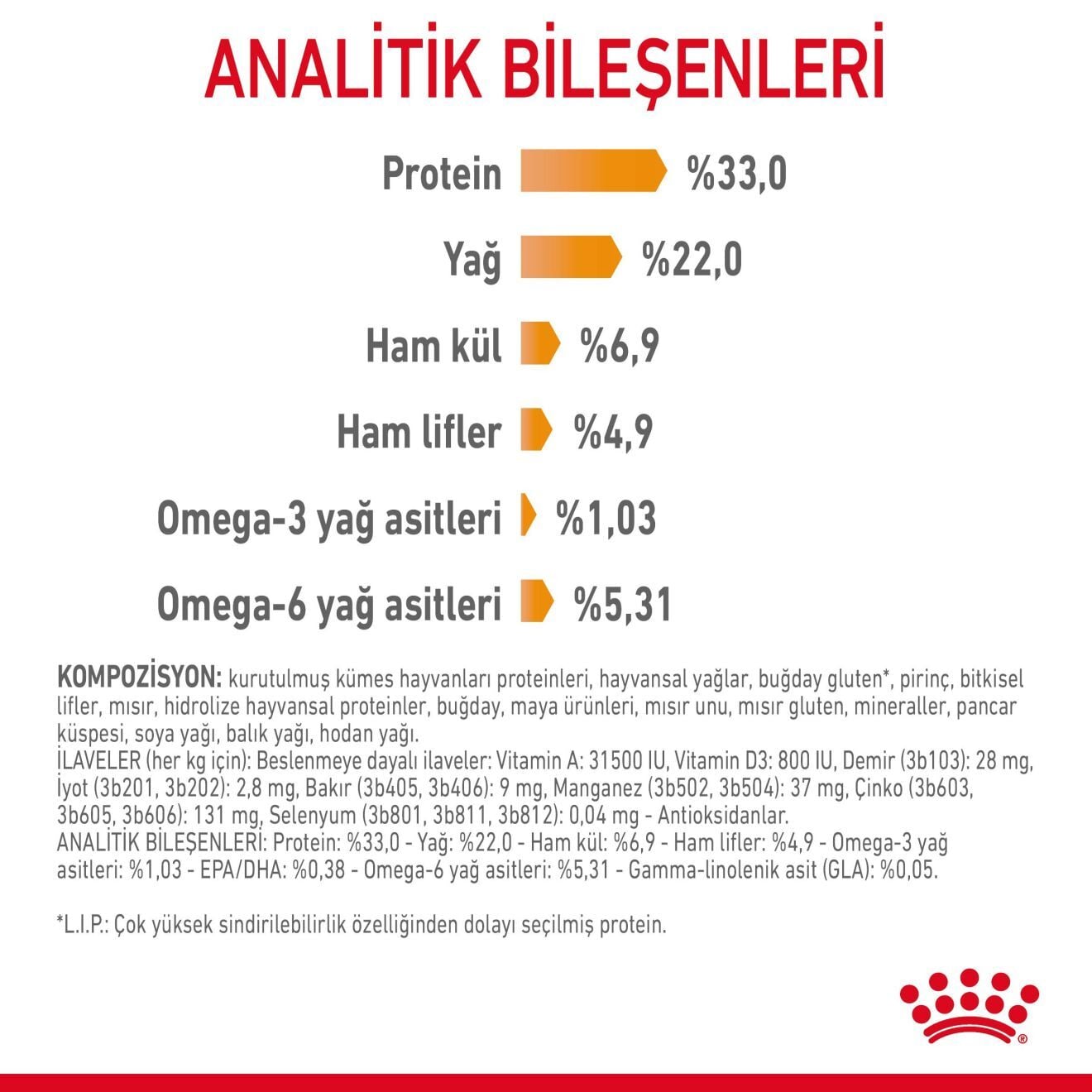 Ham Protein: %33, Ham Yağ: %22, Ham Kül: %6,9, Diyetsel lif: %5, Omega 3 yağ asidi: 11,5 g/kg, Omega 6 yağ asitleri: 52,9 g/kg