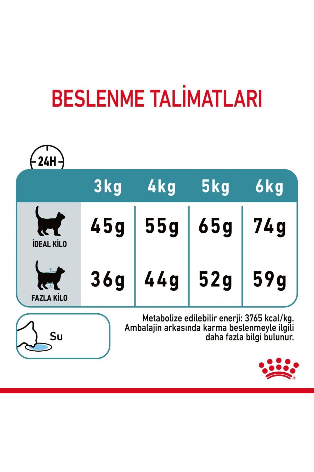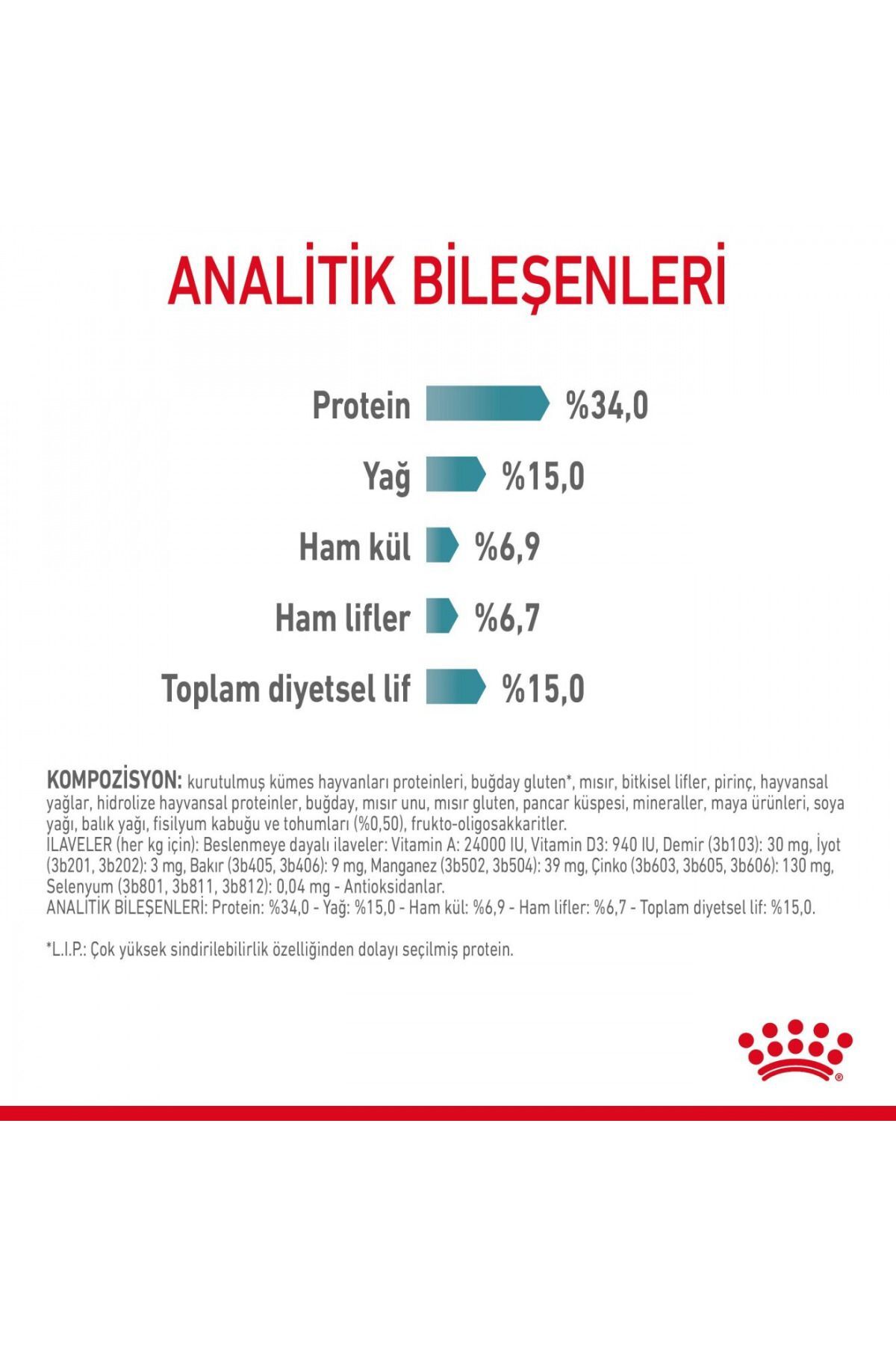 DİYETLİ FİBER KARIŞIMI DIETARY FIBRE BLEND PSİLYUM PSYLLIUM Tüy yumağı oluşumunu 14 gün içinde azaltır Kediniz tüy yumağı oluşumuna yatkın mı? Kediler günlerinin büyük bir kısmını bakım yaparak geçirirler ve bu nedenle yüksek miktarda tüy yutabilirler.; Yutulan bu tüyler, sindirim kanalında birikerek tüy yumakları oluşturabilir.; Kediler bu tüy yumaklarını kusarak veya dışkı yoluyla atabilirler.; Bazı kedilerde biriken tüyler rahatsızlığa ve daha ciddi sorunlara yol açar.; YARARLARI ROYAL CANIN® HAIRBALL CARE HAIRBALL CARE tüy birikiminin doğal yollarla vücuttan atılmasına yardımcı olan dengeli besin formülüdür.; Özel HAIRBALL CARE kompleksi, fsilyum ve bağırsak geçişini doğal olarak uyarmasına yardımcı olan özel liflerinden oluşur.; Sonuç olarak, günlük olarak yutulan tüyler, midede birikerek kusmaya sebep olmak yerine, dışkı yoluyla devamlı olarak vücuttan uzaklaştırılır.; KANITLANMIŞ SONUÇLAR KANITLANMIŞ SONUÇLAR 14 Günde tüy yumağı oluşumunu azaltır.; Hairball Care Programı 1. Bu ıslak formülün mükemmel tamamlayıcısı olan ROYAL CANIN® HAIRBALL CARE kuru mamasını deneyin.; 2. Fazla tüyleri almak için kedinizi düzenli olarak fırçalayın.; 3. Tüy yumakları yaygın olsa da, diğer sağlık sorunlarının bir işareti olabilir.; Veteriner hekiminize kedinizin tüy yumakları hakkında mutlaka bilgi verin.; 4. Kedinizin sağlığıyla ilgili herhangi bir sorunuz veya endişeniz varsa lütfen veteriner hekiminizle iletişime geçin.; Üriner Sistem Sağlığı Yetişkin bir kedinin sağlıklı üriner sistemini koruyacak şekilde dengeli mineral içeriği ile formüle edilmiştir.; KOMPOZİSYON: kurutulmuş kümes hayvanları proteinleri, buğday gluten*, mısır, bitkisel lifler, pirinç, hayvansal yağlar, hidrolize hayvansal proteinler, buğday, mısır unu, mısır gluten, pancar posası, mineraller, maya ürünleri, soya yağı, balık yağı, fisilyum kabuğu ve tohumları (%0,50), frukto-oligosakkaritler.; BESLENME TALİMATI: Tabloya bakınız.; Parti kodu, tescil numarası ve son kullanma tarihi için, ambalajin üzerine bakınız.; Serin ve kuru bir yerde saklayınız.; Royal Canin Turkey Evcil Hayvan Ürünleri Ticaret Limited Şirketi tarafından ithal edilmiştir.; İLAVELER (her kg için): Beslenmeye dayalı ilaveler: Vitamin A: 24000 IU, Vitamin D3: 940 IU, Demir (3b103): 30 mg, İyot (3b201, 3b202): 3 mg, Bakır (3b405, 3b406): 9 mg, Manganez (3b502, 3b504): 39 mg, Çinko (3b603, 3b605, 3b606): 130 mg, Selenyum (3b801, 3b811, 3b812): 0,04 mg - Antioksidanlar.; *L.; I.; P.; : çok yüksek sindirilebilirlik özelliğinden dolayı seçilmiş protein.