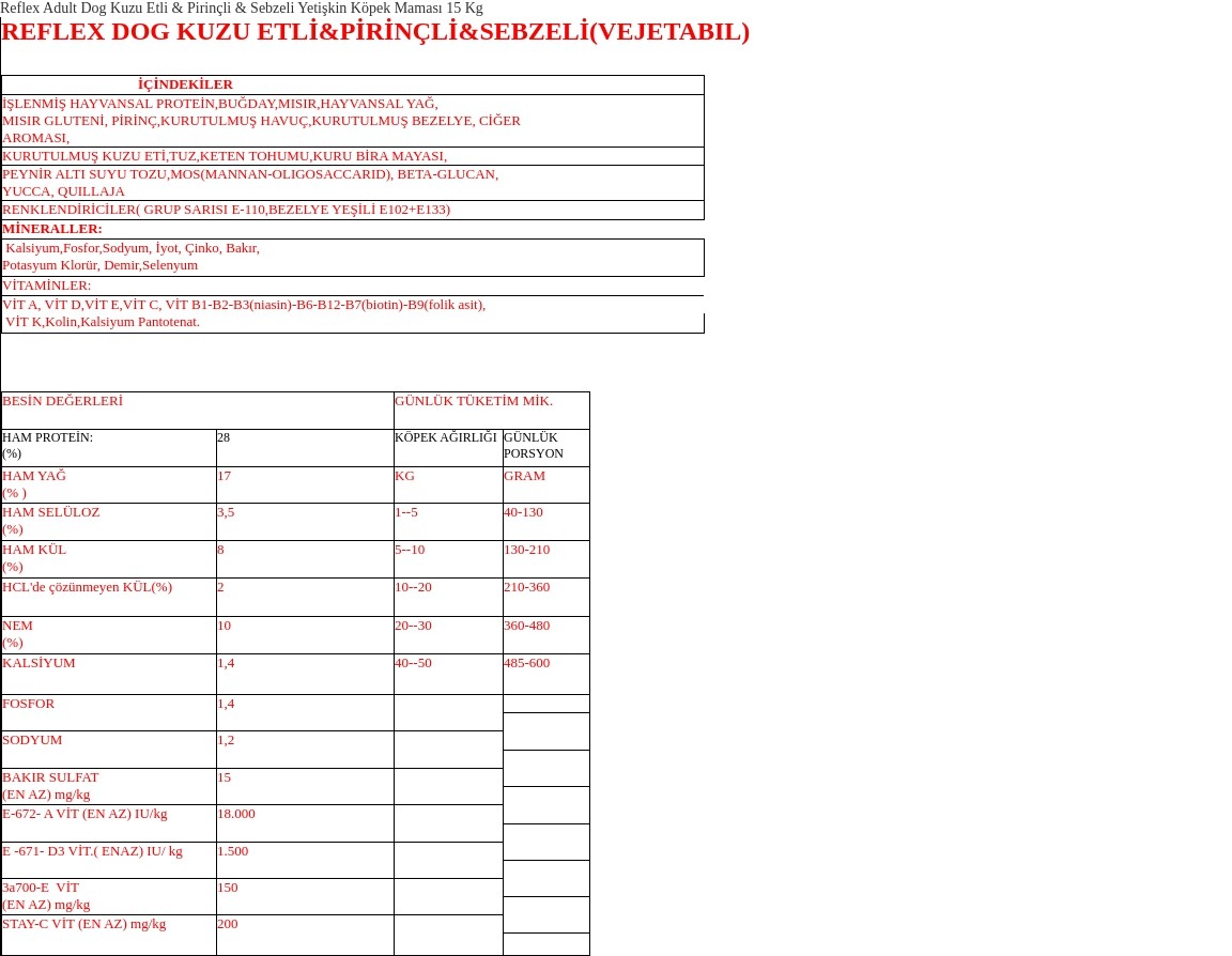 Kuzulu Pirinçli ve Sebzeli Yetişkin Köpek Maması 15kg