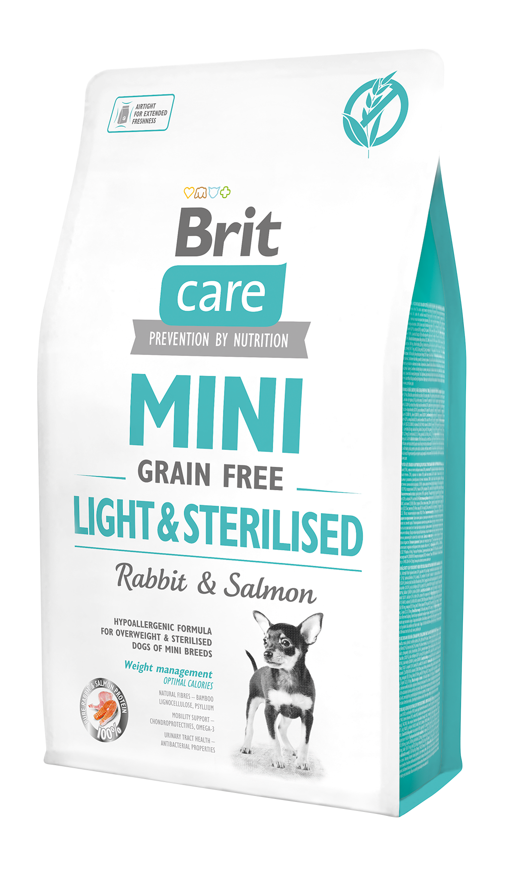 Brit care mini light tahılsız tavşan ve somonlu kısırlaştırılmış yetişkin köpek maması; Yetişkin kısırlaştırılmış küçük ırk köpeklere özel formüle edilmiştir. Kısırlaştırma işlemi görmüş veya kilo almaya yatkın köpekler için üretilmiştir. Kısırlaştırılmış köpek maması; İçeriğinde tavşan eti ve somon proteini bulunmaktadır. Bu mama, tahılsız olup hipoalerjeniktir.