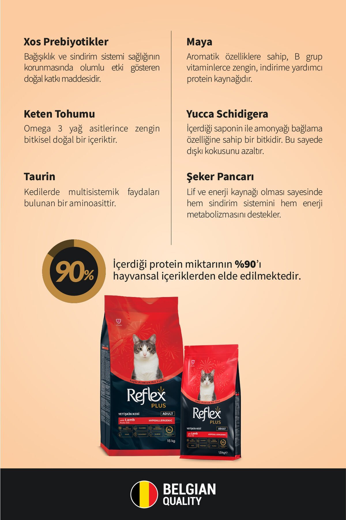 İşlenmiş kuzu proteini , İşlenmiş hayvansal protein , Mısır , Tavuk yağı ,Pirinç , Şeker pancarı , Ciğer aroması , Vitaminler ve mineraller , Keten tohumu , Ksilo-Oligosakkaritler , Bira mayası , Tuz , Yucca schidigera ,Koruyucular - antioksidanlar (E320 & E321)