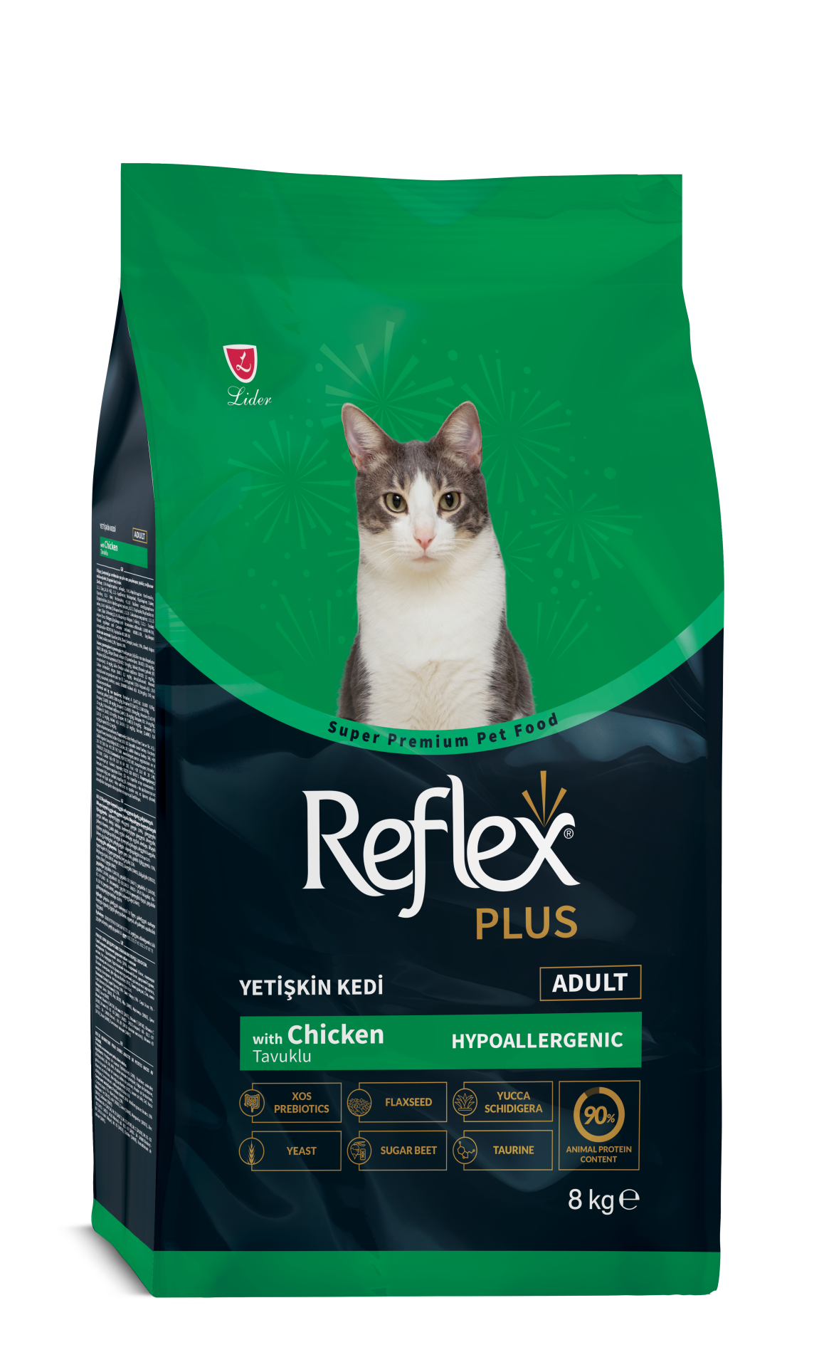 Reflex Plus Tavuklu Yetişkin Kedi Maması 12 aylıktan büyük, tüm ırklara uygun tam ve dengeli formüle edilmiş, tavuklu, kuru kedi mamasıdır. Reflex Plus Adult Cat Chicken, tüm yetişkin ırklar için, günlük beslenme ihtiyaçlarını karşılamak üzere kedi/köpek beslenme uzmanları tarafından özenle formüle edilmiş tam ve dengeli, tavuk proteini içeren süperpremium kedi mamasıdır.