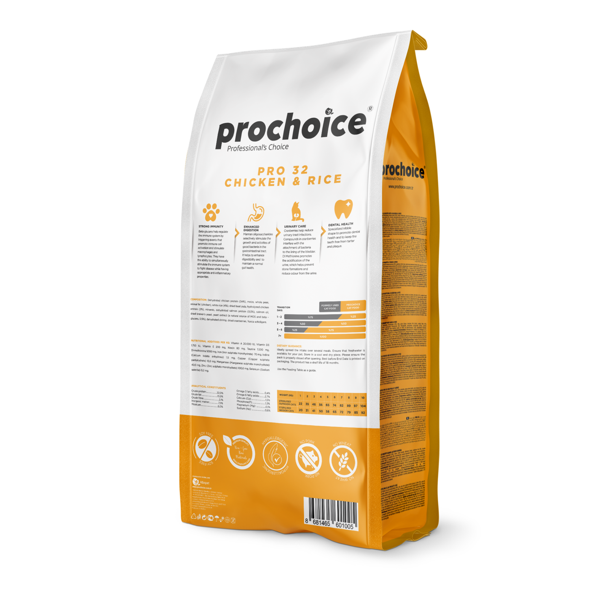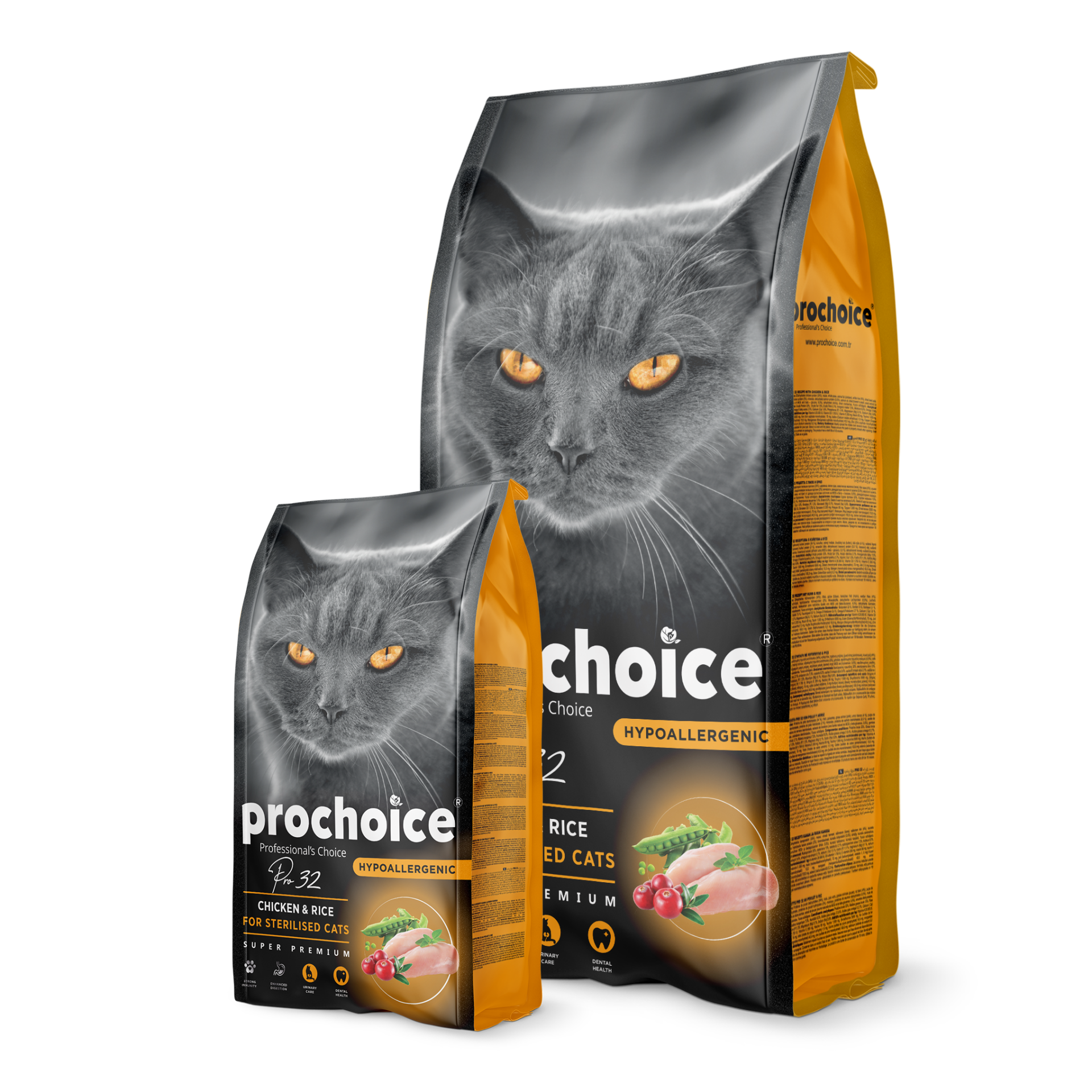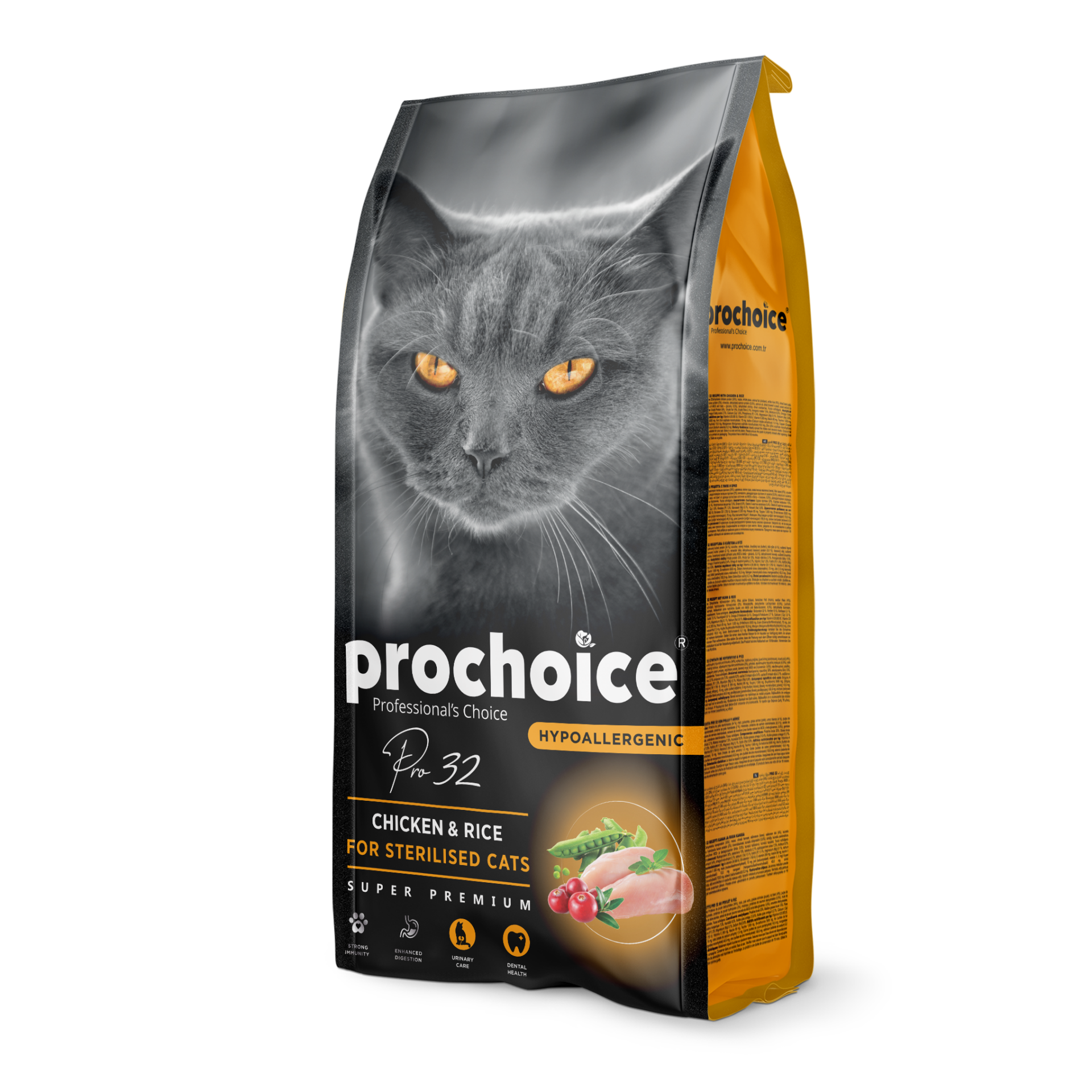 Pro Choice Pro 32, kısırlaştırılmış yetişkin kediler için özel olarak geliştirilmiş, tavuk eti ve pirinç ile zenginleştirilmiş süper premium bir mamadır. Kısırlaştırılmış kedilerin enerji ihtiyacına uygun olarak formüle edilen bu mama, düşük yağ ve yüksek protein dengesiyle kas yapısını korur, kilo alımını kontrol altında tutar. İçeriğindeki fonksiyonel bileşenler bağışıklığı güçlendirir, sindirim sağlığını destekler ve idrar yollarını korur.